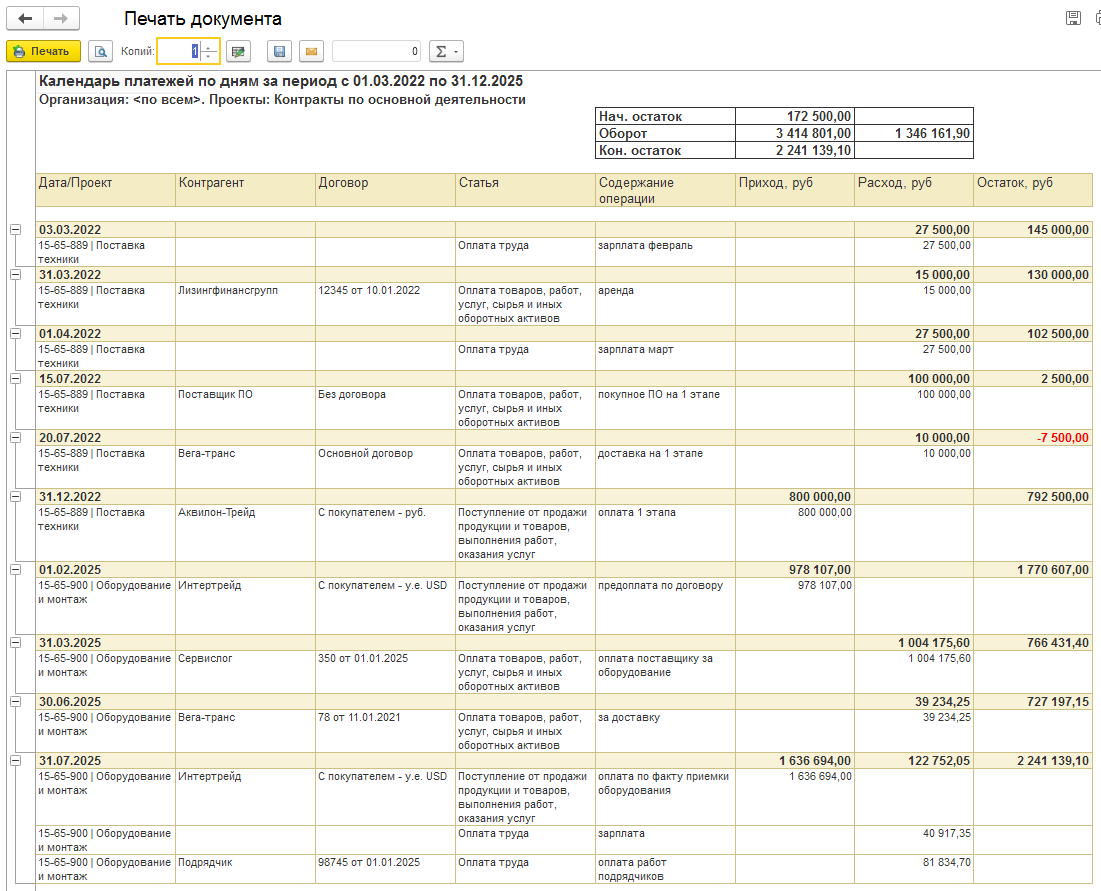 Текущий остаток показывает состояние дел на каждую дату движения денежных средств. Красным – недостаток средств, то есть кассовый разрыв в проекте.
