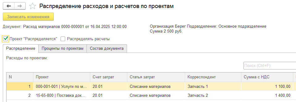 Распределение расходов по проектам для документа "Расход материалов / Требование-накладная"