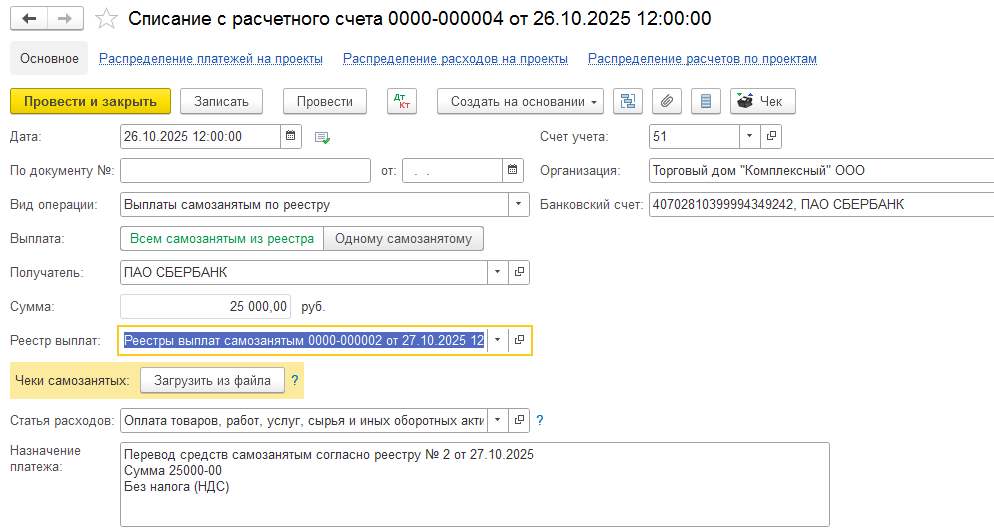 Если в банковском документе выбран реестр выплат самозанятым, то, начиная с версии 3.0.9, появилась возможность сразу заполнить распределение платежа данными из распределения расходов по проектам.