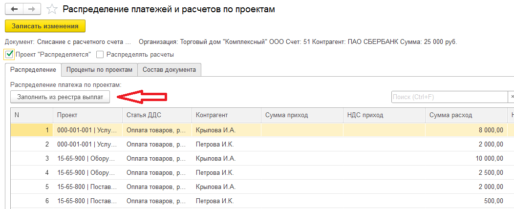 Вызовите обработку распределения платежей по проектам из меню "Ввод на основании" и на закладке "Распределение" нажмите кнопку "Заполнить из реестра выплат".
