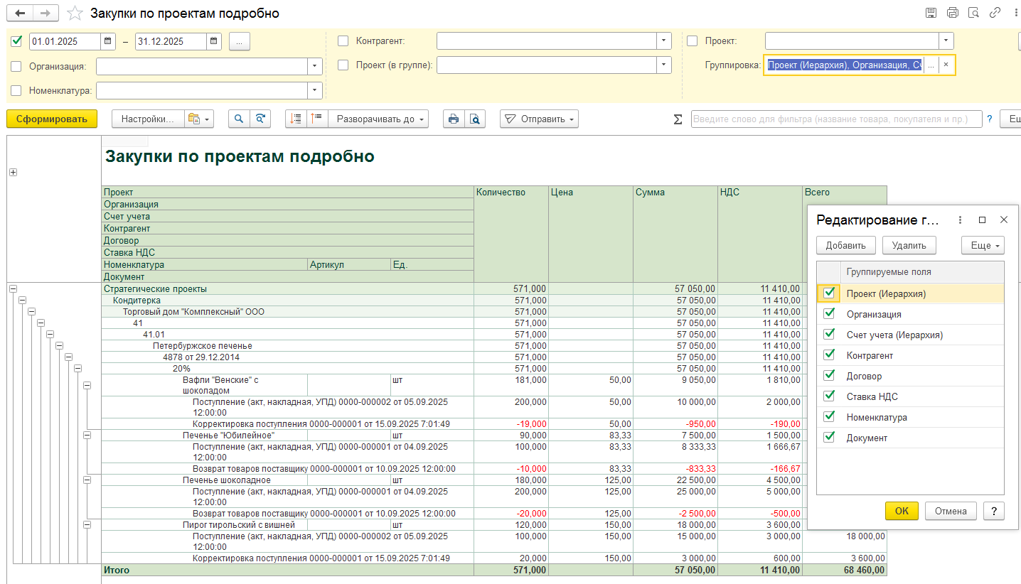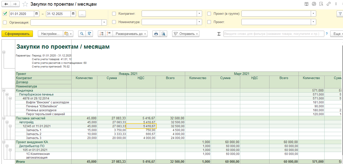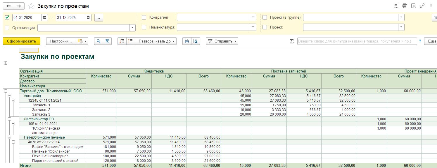 Отчет формируется в разрезе проектов, организаций, номенклатуры, контрагентов, договоров, счетов учета, ставок НДС.