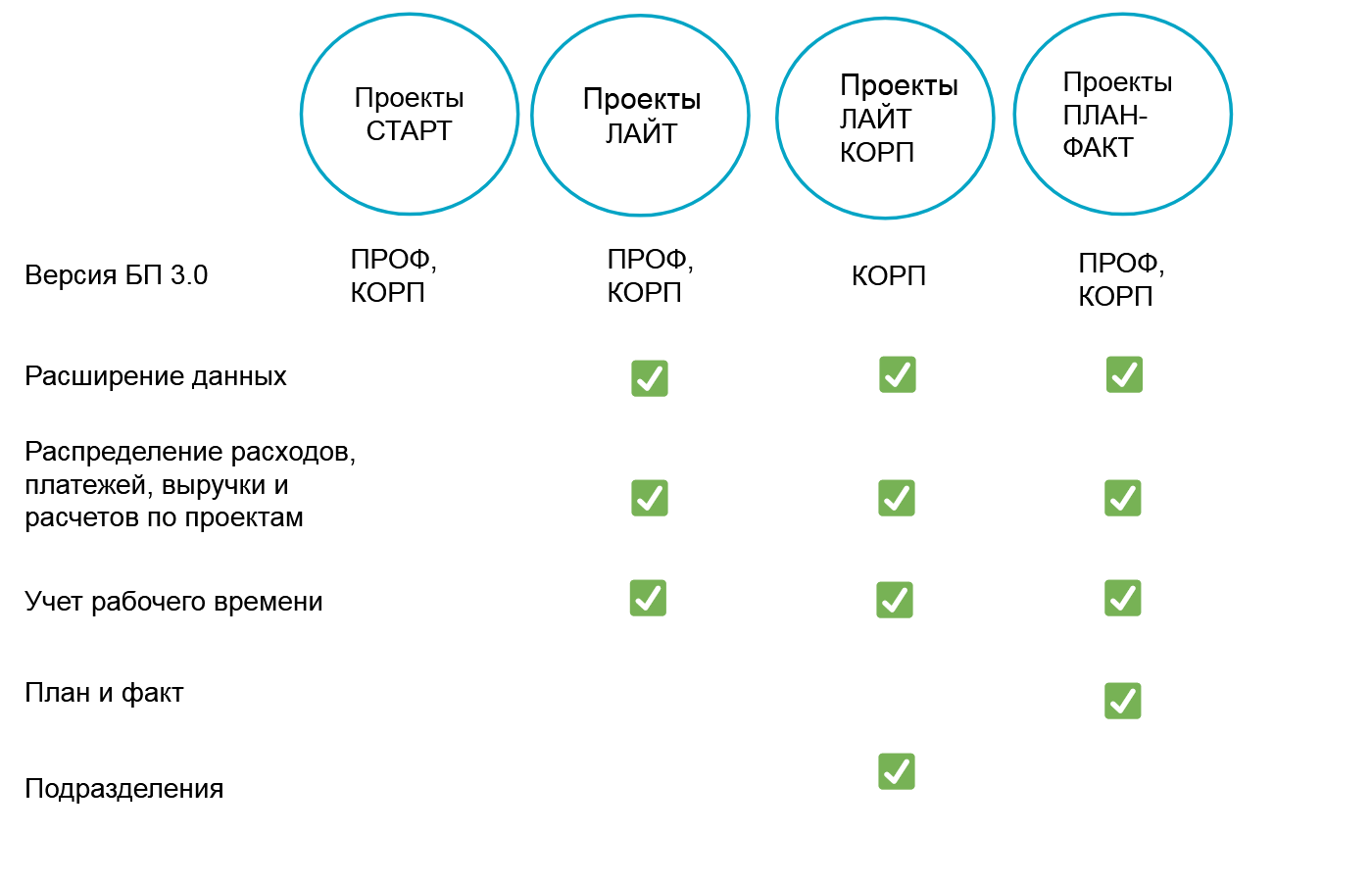 1. Линейка расширений "Проекты": редакции СТАРТ, ЛАЙТ и ЛАЙТ КОРП – это расширение. Редакция ЛАЙТ КОРП учитывает подразделения и, следовательно, работает на "1С:Бухгалтерии КОРП". Остальные редакции совместимы как с БП ПРОФ, так и БП КОРП – но без учета подразделений.